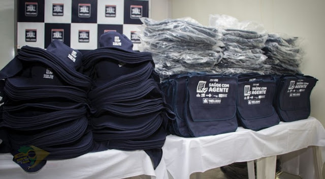Foram entregues kits compostos por bolsa em lona personalizada, chapéu safari e colete, desse total, destinados aos Agentes de Combate às Endemias e para Agentes Comunitários de Saúde.
